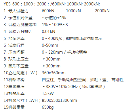 產(chǎn)品規(guī)格 YES-600;1000;2000;600kN;1000kN;;2000kN;YES系列經(jīng)濟(jì)型數(shù)顯式壓力試驗(yàn)機(jī)